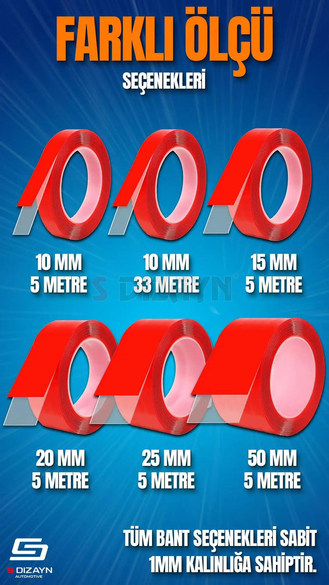 • Çift taraflı şeffaf bant 1mm kalınlık 5mm/10mm/15mm/20mm/25mm/50mm genişliğe 5metre/33metre uzunluğa sahiptir.